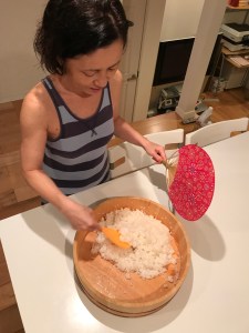 mixed all over the rice and let the rice become skin-warm using a paper fan.